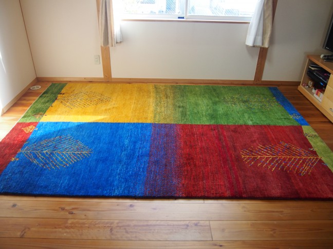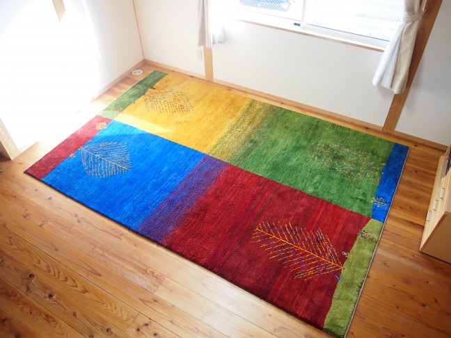 2016.03.31<我が家のギャッベ>鳥取市 Y様邸のギャッベ こちらの作品もとても珍しい、綺麗に4色に色分けされた1枚。 明るい木目のリビングの床を鮮やかに彩り、 お部屋を引き立ててくれていますね (o ^ – ^ o)♪ 季節によって向きを変えても楽しめますね!