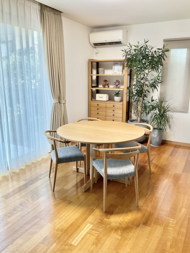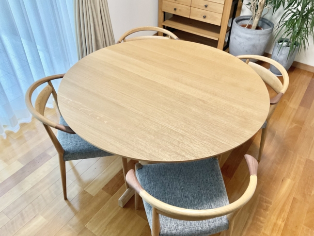 以前から丸いダイニングテーブルを気になられており、今回、当店の大人気メーカー様、日進木工様のwhite woodシリーズをお買いげいただきました😄