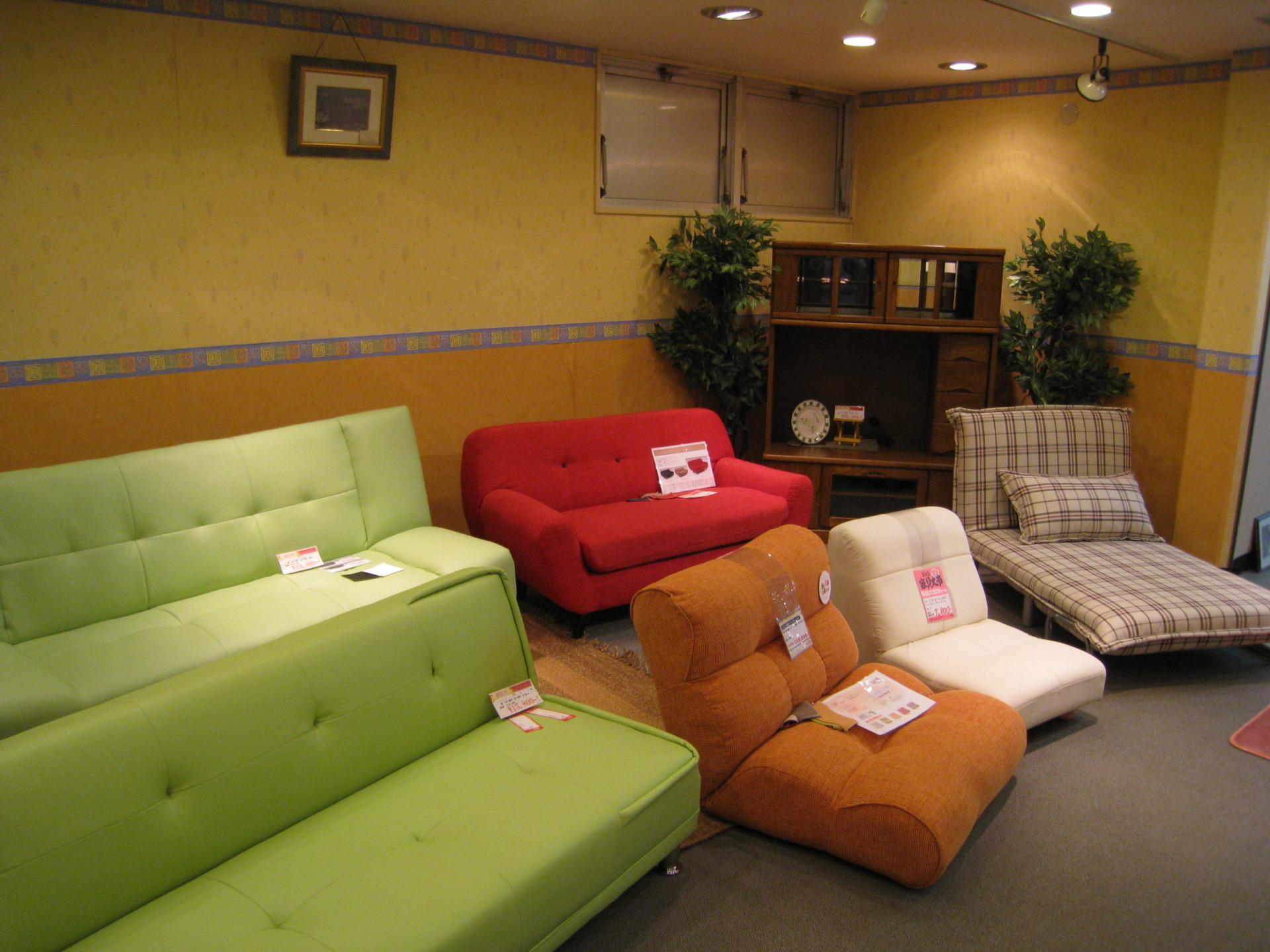 多彩な色使いのソファが盛りだくさんです。明るいソファが一つあるだけで、お部屋の雰囲気が