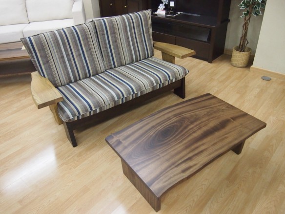 2013.04.03お買い得な一枚板のローテーブル入荷しました! 楠の一枚板のローテーブルが入荷しました!! サイズは、幅100×奥行62×高さ33cmと ソファの前や、ちょっとしたローテーブルで使いやすい大きさです。 で、、 お値段はなんと、 ¥33,800-(税込) とかなりお買い得価格と なっております。 ソファ前に置くとこんな感じです。 一枚板なので、一点ものです。 一枚板でなくとも、このくらいの価格は するので、とても お値打ち品ですよ~