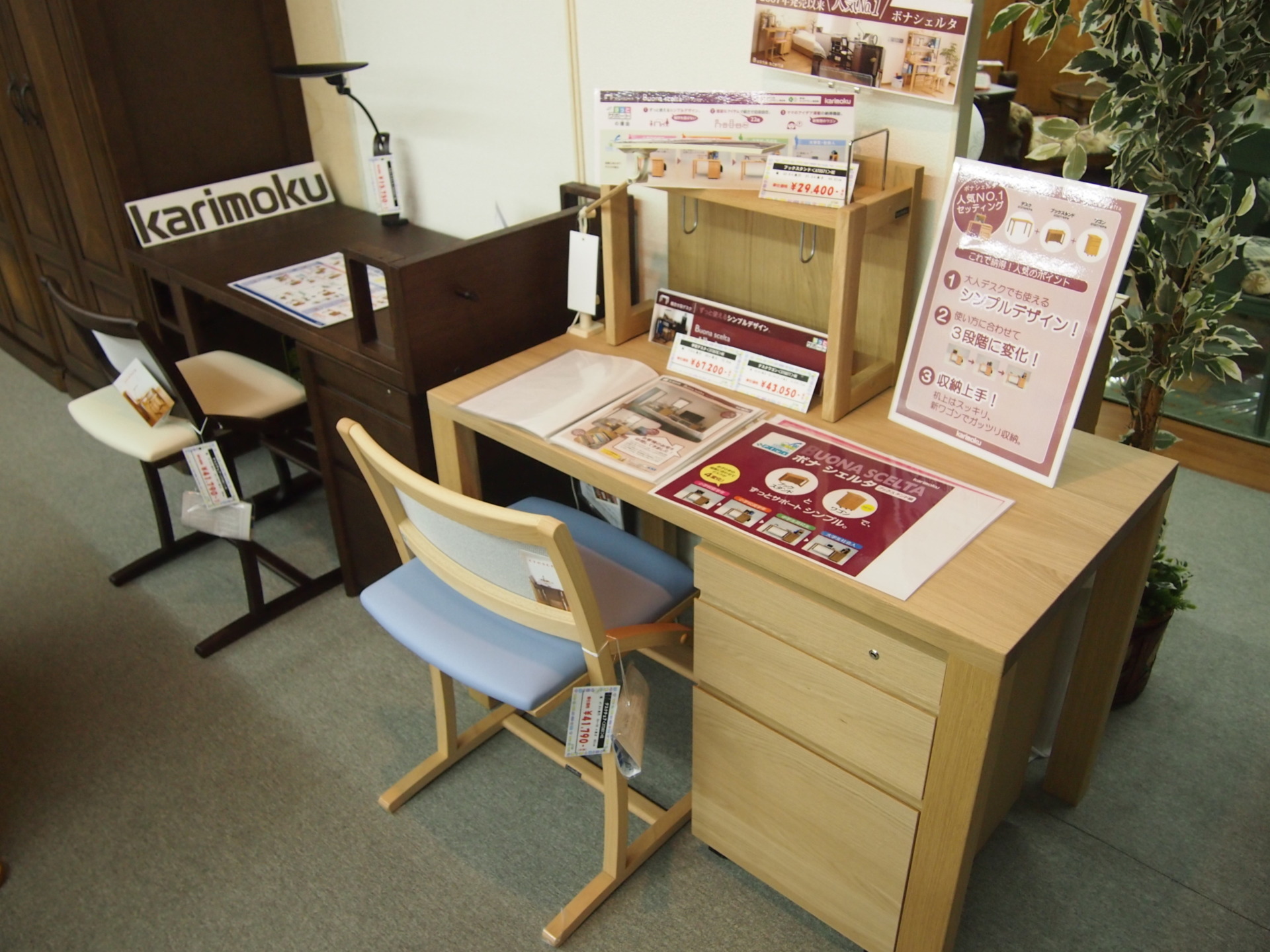 2012.11.29カリモクの学習机、入荷しました。 木を知り、木を愛する家具メーカー「カリモク」の学習机。 その中でも人気№1の<ボナシェルタ>を2台入荷しました。 飽きのこないシンプルなデザインになっているので大人になっても使えます。 高い木工加工技術を持つ「カリモク」ならではの こだわりを、その目で確かめてみてください。